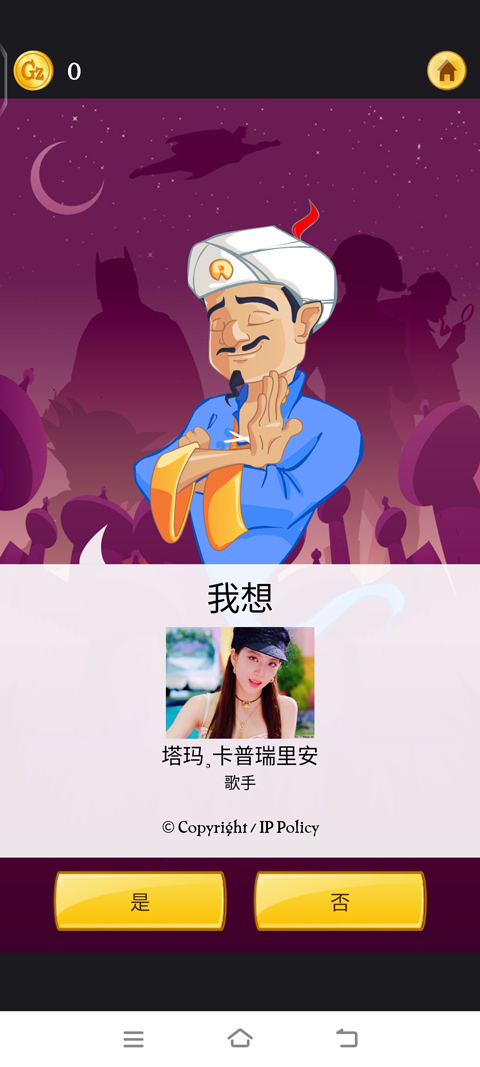 与此同时,游戏玩法既简单又有趣。在游戏开始之前,玩家能够挑选一种人物设定,例如政治家、娱乐明星或者著名卡通角色等等。接着点击开始,灯神便会提出一系列问题,玩家只需点击“是”“否”或者“不知道”这类回答。经过数轮问答之后,这位“网络天才”就会说出玩家心中所想的答案。