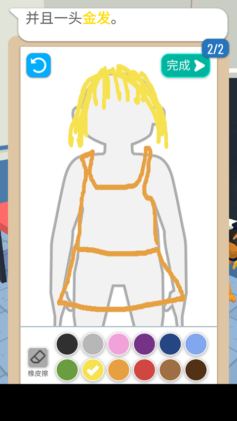 2、接着要根据描述对应画图“她穿着一条橙色裙子”;