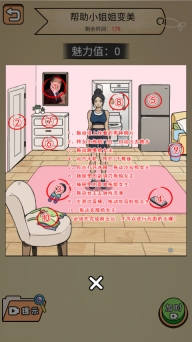 把床上的裙子拖过来给女生穿上,接着把教练拖到雕塑上面,然后点击打开柜子,再把粉刷拖到雕塑处。把所有外卖盒都丢进垃圾桶,打包后拖到窗外。先把所有酒瓶拖到酒驾的位置,再点击冰箱打开,拖到酒驾那里放进去。点击墙上的日历,把所有私教课都涂掉。最后把桌子上的茶托拿给女主。