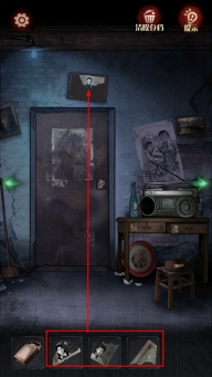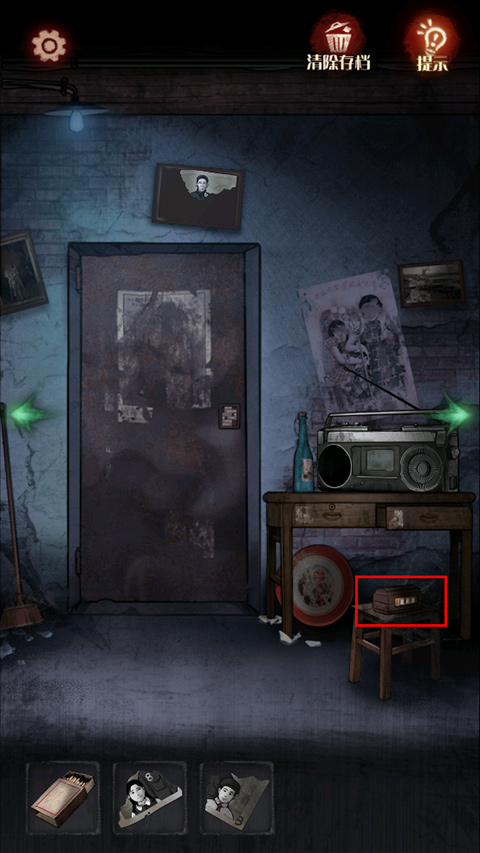 16、离开铁门所在的房间,来到收音机旁,依次把【电池】【磁带】【播放按钮】【收音机喇叭】安装好,接着打开收音机,从而获取到线索——橱窗密码为:虎猪龙。