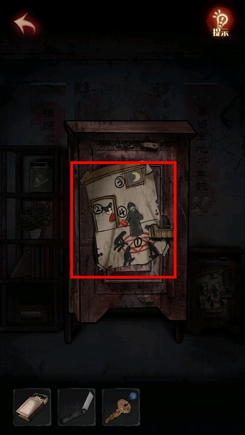 4、查看纸人下方的柜子,留意柜子上的图案:1阵图,2小女孩,3月亮,4书 。依据这些线索开启上方的锁,从而获取【旧衣服】与【暗红钥匙】。