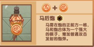 马应处在炮正前方一格的位置,当马与炮合为一体时,就形成了一个极为强大的棋子,能够增加普通攻击所发射的炮弹数量。