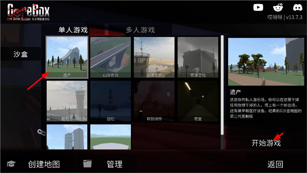 2、游戏包含单人模式与多人模式。在单人模式里,存在各类不同的场景,玩家既能够从这些场景中挑选其一,也能够自行创建地图。若选择遗产地图,点击“开始游戏”即可。