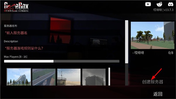 3、玩家也可以自己创建房间,输入服务器名称和游戏规则并设置地图和加入的人数即可。