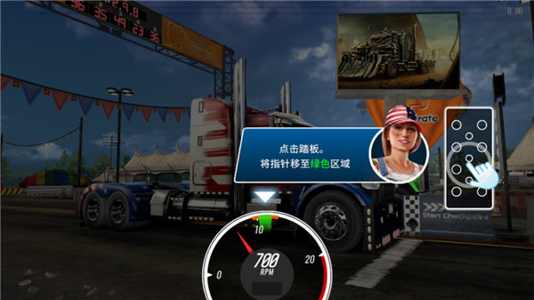 1. 开启大卡车竞速模拟器的最新版本,进入到游戏界面之中,点击右侧的踏板,待指针停留在绿色区域时,即可起步。