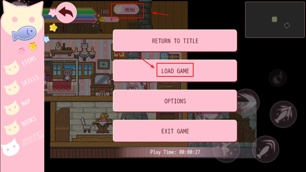 1. 进入游戏之后,点击上方的MENU,接着点击左侧的SYSTEM,再选择LOAD GAME。