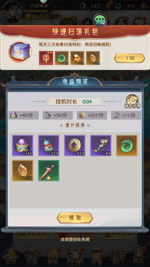 2、游戏内挂机一段时间即可获得大量奖励