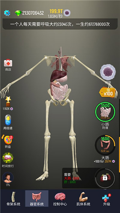 2、从最先的骨架开始解锁,可以先购买100T的细胞开始养成,