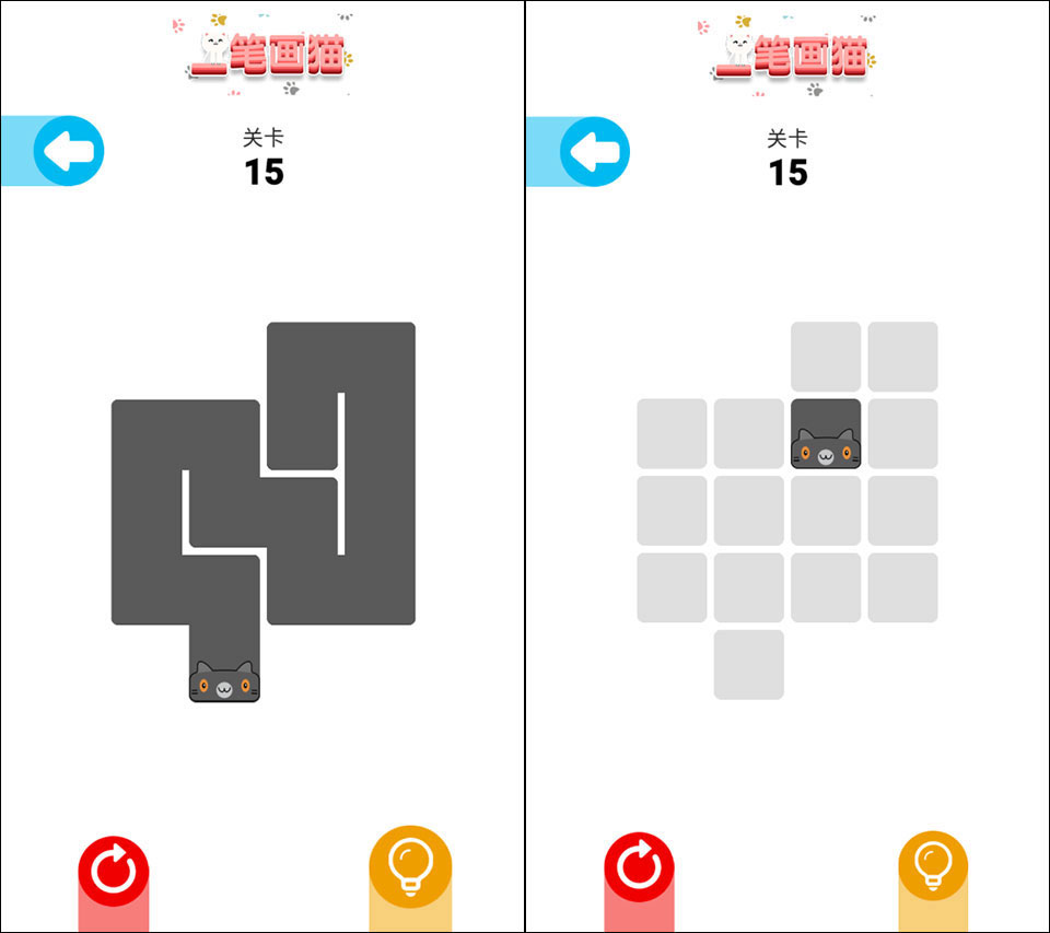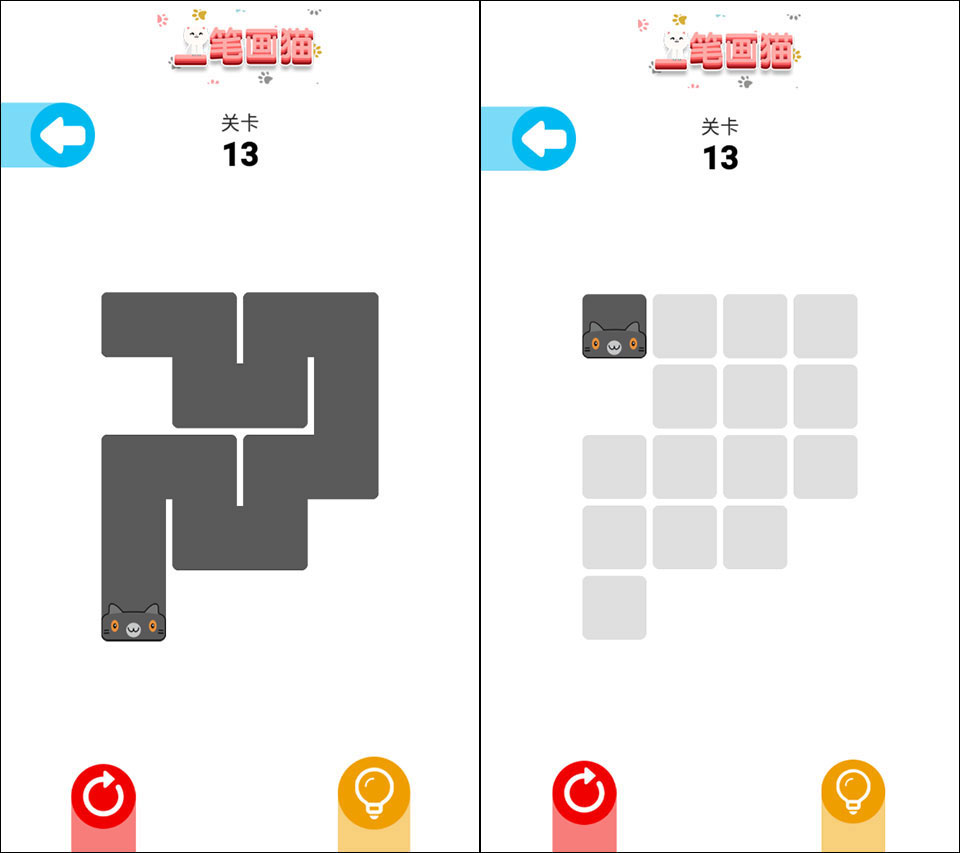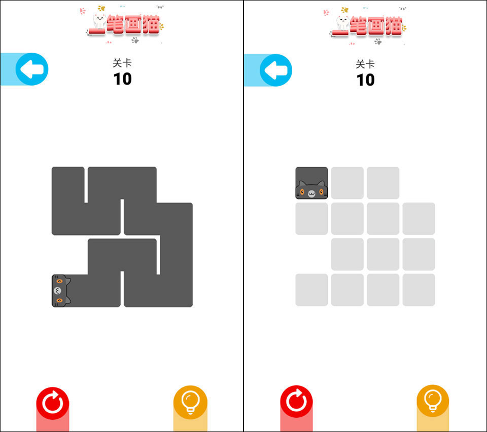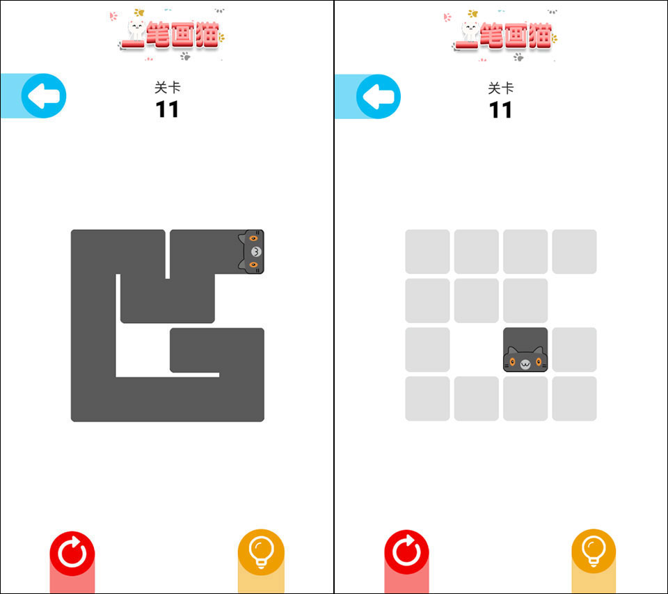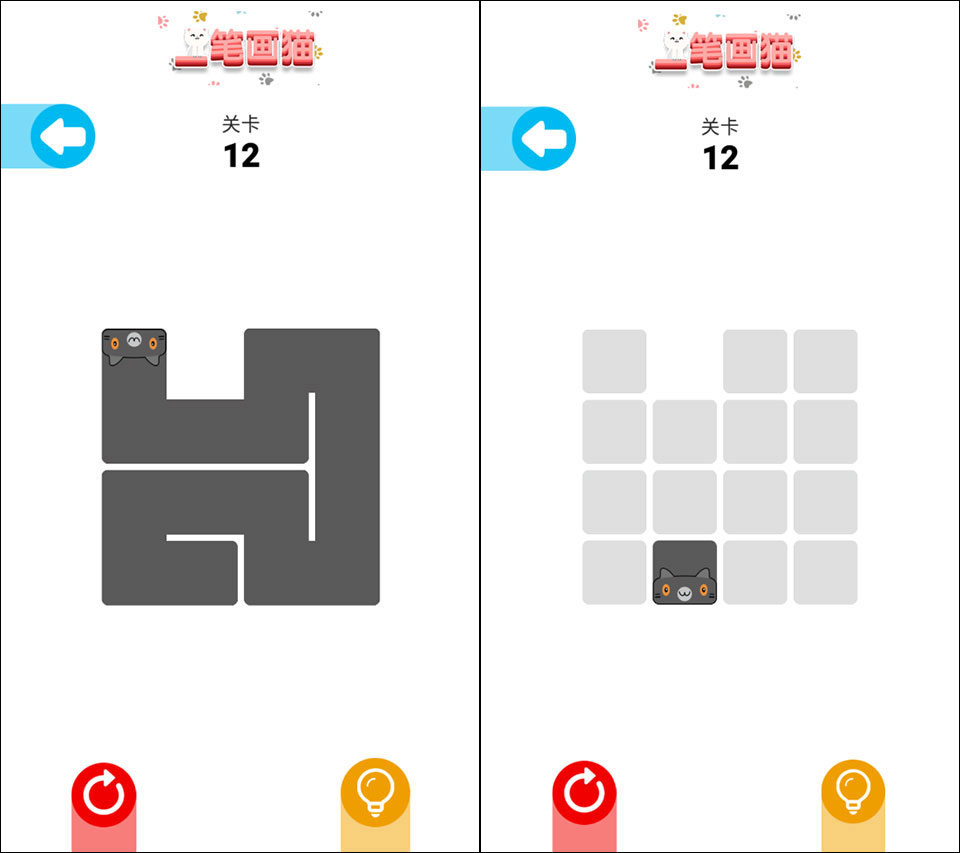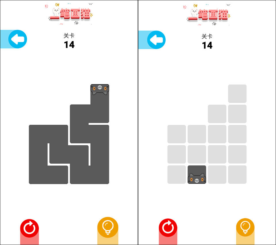 一笔画猫,这是一款超有趣的休闲益智游戏,玩家要做的,就是按住可爱的猫猫头,充分施展聪明才智,让猫猫把图中的灰格子全部走过,而且每格只能经过一次,这样才算闯关成功。这款游戏关卡模式丰富多样,光是灰猫猫头就设置了2000关等你来挑战。要是碰到难题,千万别慌,游戏设有提示功能,能为你指明通关的方法。不仅如此,还可以一键回到原点,让你重新梳理思路,再次出发。你是不是很想解锁其他品种的可爱猫猫呢?那就赶紧来本站下载游戏,参与一笔挑战吧!