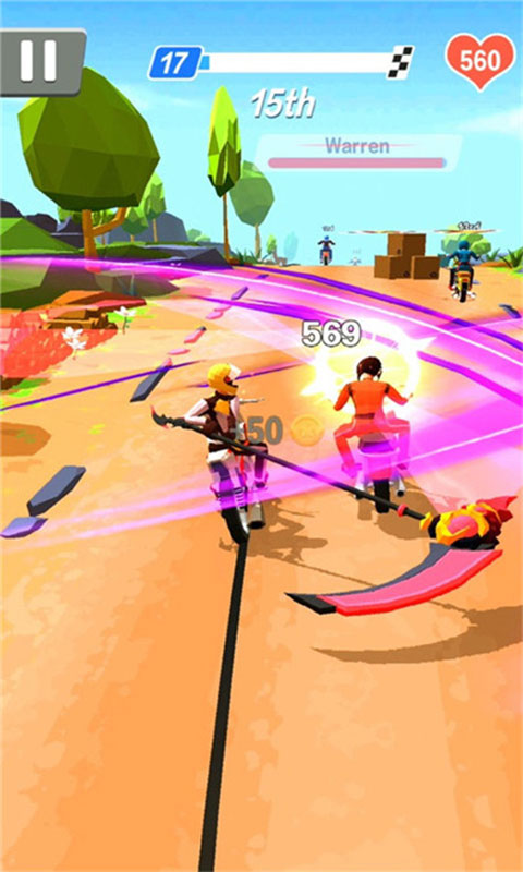 1、先把暴力摩托飞车下载安装完毕,启动游戏后,所有人都会出现在起点位置,彼此之间的间距不算大。这时尽量让自己处于最后一名的位置,如此一来,你就能攻击到每一个人了。