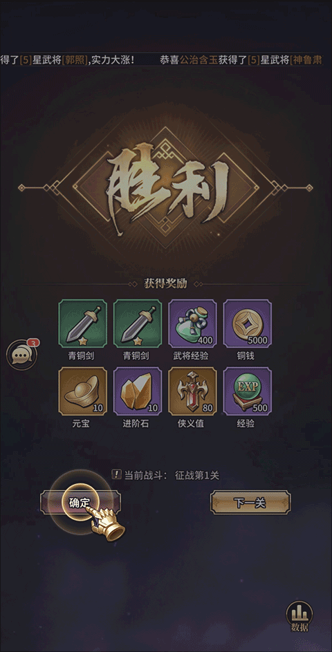5、最终玩家获得了胜利,点击确定来领取你的奖励吧。