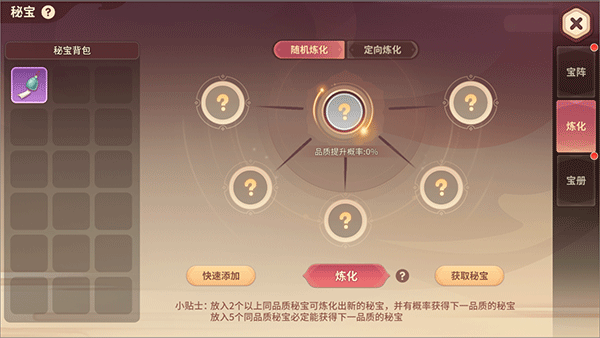 各位大侠在日常活动中,能够收集各类秘宝用于炼化。只要放入2个及以上相同品质的秘宝,就能炼化出新秘宝。放入的同品质秘宝数量越多,提升秘宝品质的几率就越高。要是放入5个同品质的秘宝,必定能炼化出一个新的高级秘宝。