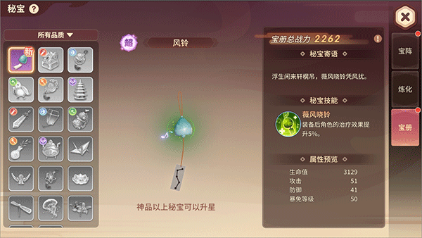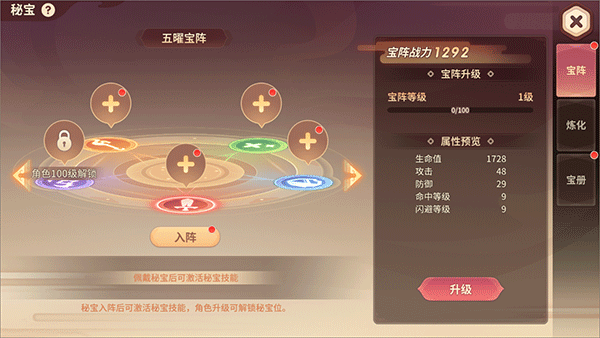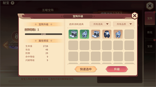 同时,宝阵的等级也是可以提升的,只需消耗各类没用的装备作为材料即可。提升宝阵等级,也会为秘宝的属性增幅提供更高的数值。
