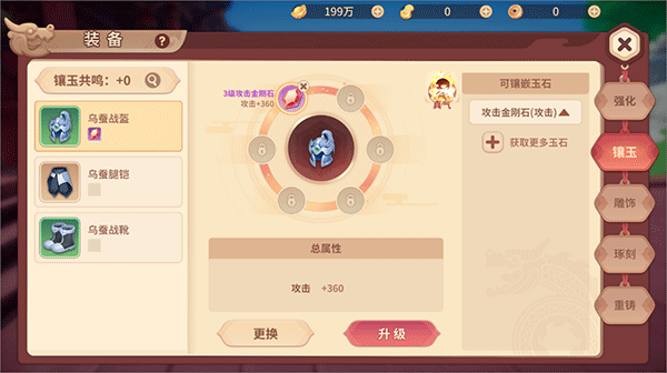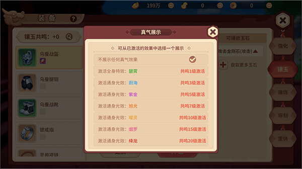 装备镶玉,即在装备所具备的镶嵌孔中,嵌入具有所需属性的宝石,从而提升装备的附加属性。当全身装备镶玉的总等级达到特定标准时,便会开启镶玉共鸣效果,不仅能进一步增强属性,还可激活炫酷的护体真气特效。
