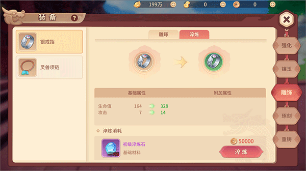 在装备当中,仅有戒指与项链能够开展雕饰操作。雕饰具体分为雕琢和淬炼这两种类型。通过雕琢,能够提高戒指和项链的雕琢等级,进而增强戒指和项链本身所具备的固有属性;至于淬炼,它会提升戒指和项链的品质等级,而且还有一定几率获取附加属性。