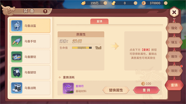 在装备打造中共有五项分类,分别是强化、镶玉、雕饰、琢刻、重铸。每一项都可以对装备的属性带来提升或调整。