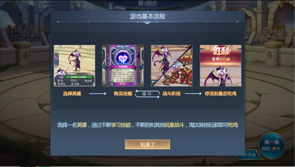 选择一名英雄,通过不断学习技能,不断的和其他玩家战斗,淘汰其他玩家即可吃鸡