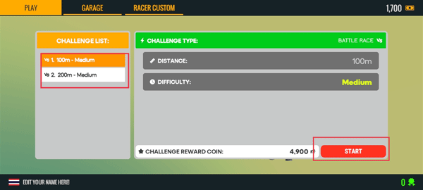 2、可选择两种路段,分别为100米和200米。选择完毕后,点击“START”开启游戏。