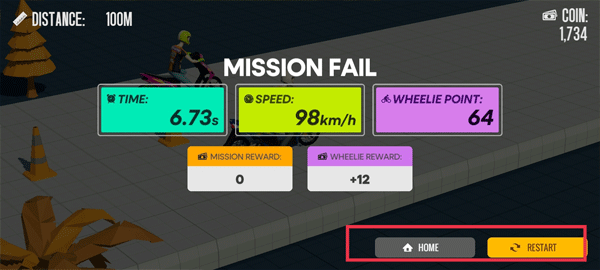6、比赛结束后,会展示你赛车的用时、速度等信息。你既可以点击“HOME”返回主页,也能够点击“RESTART”重新进行比赛。