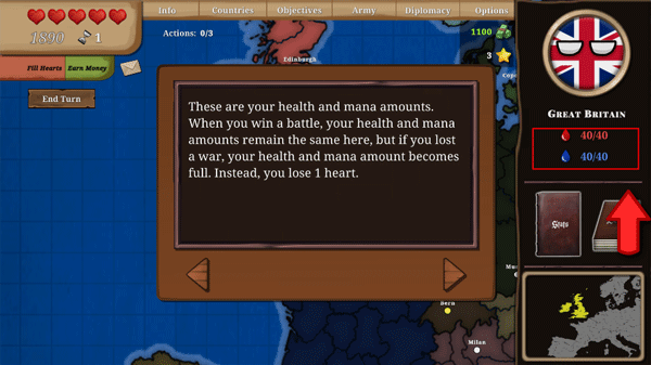 9、每当你进攻或防御一个领土,亦或是宣战,都需发送盟友请求,此操作消耗1个行动。每个回合,你最多可消耗3或4个行动,之后必须结束该回合。当你结束回合时,你的行动次数将重置,同时其他国家会执行他们的行动。此外,每经过2个回合,你会获得1颗心。