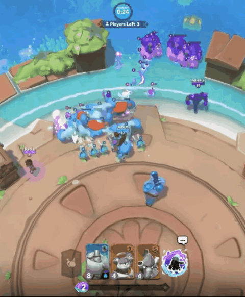 4、游戏场景设定为一座座缓缓下沉的海岛,8名玩家会同时踏入岛屿。每位玩家所操控的角色与单位,都有着独一无二的颜色。在岛上,你既能与其他探索者展开竞争,也能和岛上的怪兽进行战斗,借此获取经验与道具。与散布于海岛上的箱子进行互动,便可以解锁道具、卡牌以及游戏资源。随着时间不断推移,小岛会渐渐下沉,游戏中的安全区也会向中心收缩,这就迫使游戏内的玩家相互争斗。