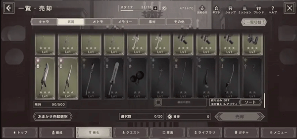 然后我们需要来到角色强化页面,如上图所示。其中最后一栏是出售界面,在这里我们可以将上述的多余的低星级角色以及白色武器进行出售,这样一来就可以快速获取大量的金币了。