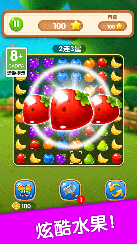 2、点击上方道具“锤子”,选择想要消除的水果,就能帮你消除更多水果啦。