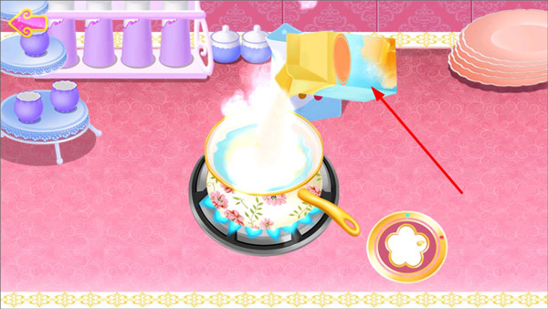 2、来到厨房页面,一开始依照提示将水壶中的水倒进锅里。