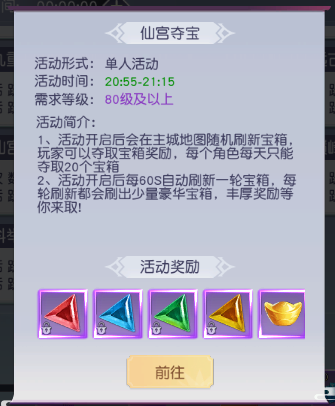 每晚8点55-9点15分会开启仙宫夺宝活动,开启宝箱获得大量宝石盒元宝奖励;