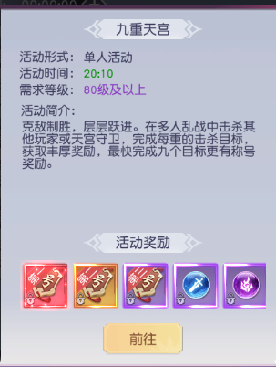 每晚8点10分会开启限时活动九重天宫或仙魔之战,完成九重天宫可以获得大量灵宝精华,前三名更有专属称号奖励;