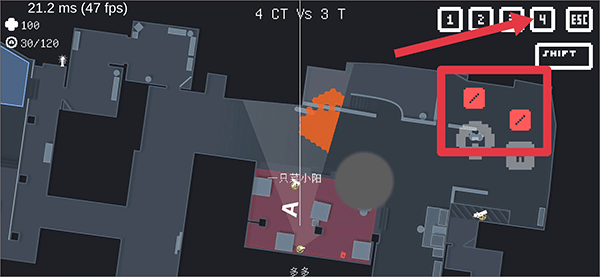 5、在回防模式下,玩家会被随机划分到T和CT阵营。T阵营的玩家在游戏开始时,屏幕上方会显示本局的包点位置,玩家需前往A点,抵达A点后,点击右上角数字4,接着点击红色按钮以放置炸弹。