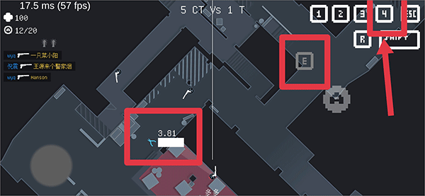6、而若为CT阵营时,玩家需要前方被放置炸弹的区域点中,点击右上角数字4,并点击按钮E拆除炸弹即可