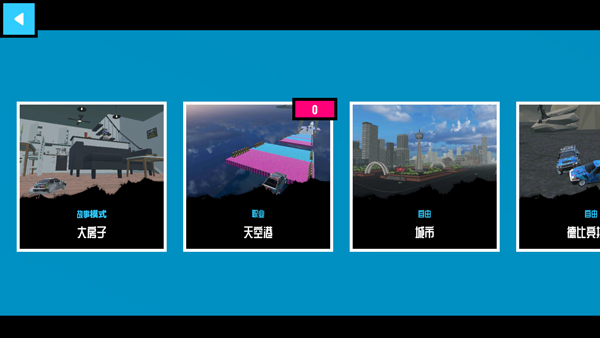 赛道、滑梯、撞墙设施、汽车蹦床区域、机器压力机装置、跑酷专区、天空遮挡区域、漂移车模拟体验区