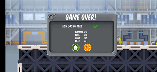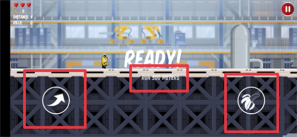 1、当你进入游戏,首先映入眼帘的是过关目标,接着通过右边按钮能操控小黄人进行跳跃,左边按钮则用于射击。