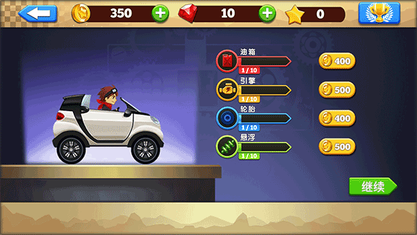 3、汽车具备4个能够进行升级改造的部件,分别为:油箱、引擎、轮胎以及悬浮。