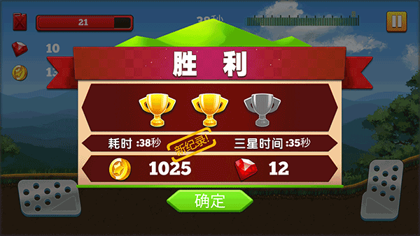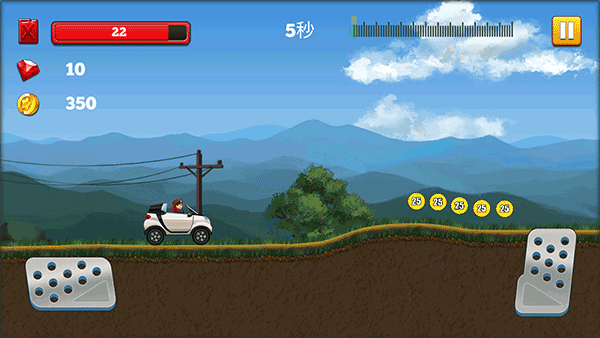5、游戏设有两个操作按钮,分别为油门和刹车,采用虚拟按键操控。左边的按键用于刹车,右边的按键控制油门。按下油门即可前进,抵达指定地点就算通关。界面上方的红色标识代表汽油量,玩家需留意对油量的把控。