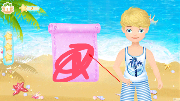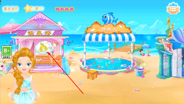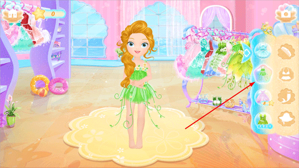 2、第一步,为公主换上沙滩连衣裙。在界面右侧找到装扮类目并点击,即可为公主进行换装。