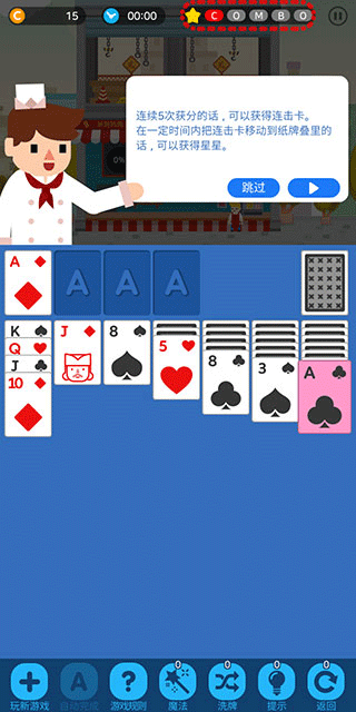 5、若能连续5次得分,就能获取连击卡。在特定时间内,将连击卡移入纸牌叠,便可得到星星。