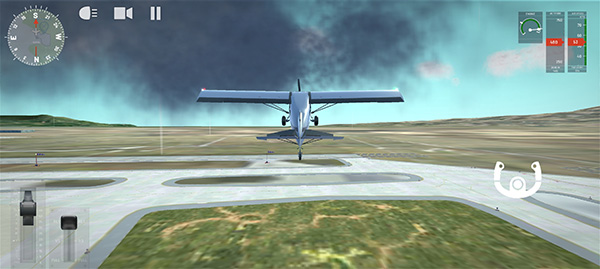 8、滑动右下角的方向盘按钮并向下拉动,即可实现起飞。起飞后,便能操控飞机的上下左右方向。