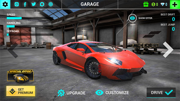 1、首先进入游戏可以通过左右滑动来更换汽车,一辆好汽车是比赛获胜的关键