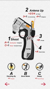 4、该骑士通过腰带枪进行变身。第一步,点击第一个按钮来组装手枪;接着点击第二个按钮,使变身进入白热化阶段,此时扣动扳机。