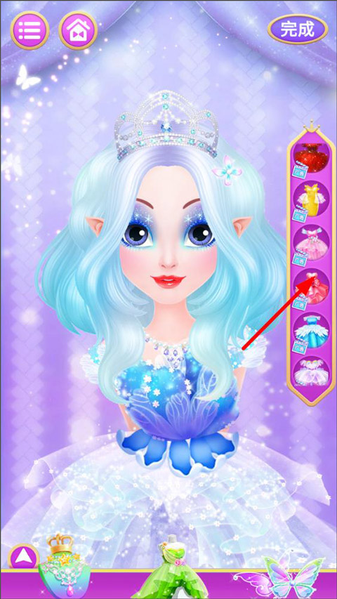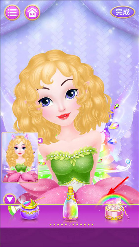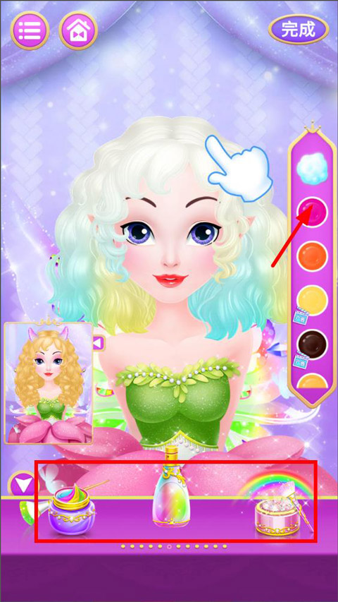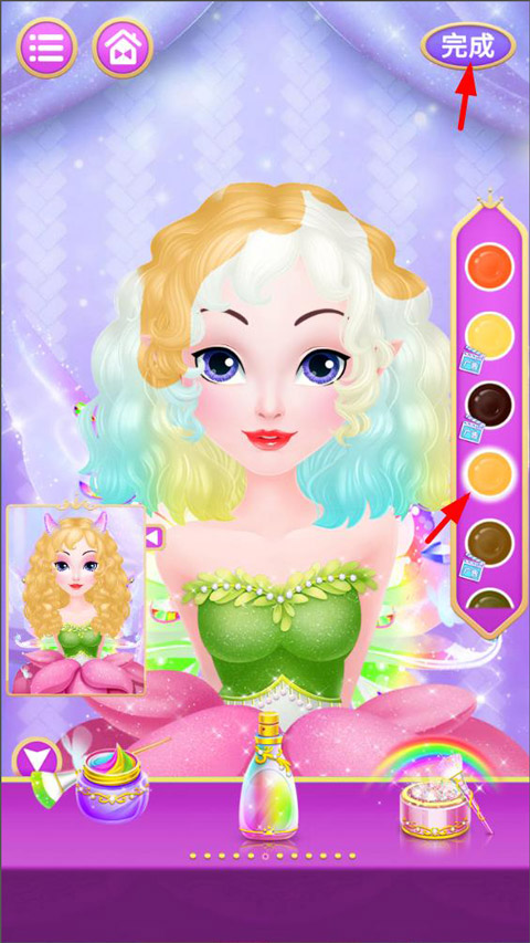 4、玩家点击染发方式,接着选择右侧的染发方式,随后用手指在公主的头发上轻轻涂抹就能进行染发。待头发染好后,点击右上角的“完成”按钮,便可完成保存。