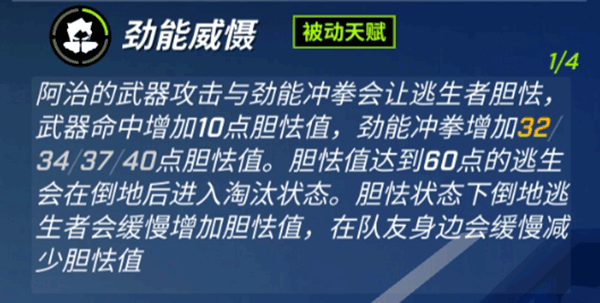 第一步:首先要把劲能威慑点满(效果:用技能击中逃生加40点胆怯值)