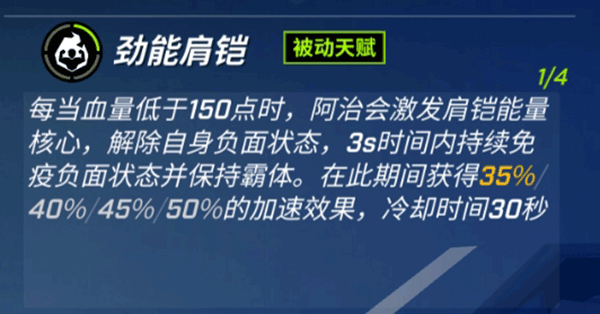 受到一定伤害会触发霸体和加速效果。超高的移速加成?霸体效果很好的保障了阿治生存能力。