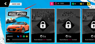 2、在游戏开启前,我们能前往车库解锁心仪的赛车,赛车分为C、B、A、S等级。不过,因当下资金短缺,目前仅有一辆车。若直接点击右下角的黄色按钮,就会返回主页面,接着点击想玩的模式,此处选择的是职业模式。