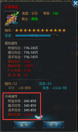 是游戏中后期迅速提升战力的其中一个重要系统,每阶都能提供大量的攻击和一点百分比的暴击抗性。(锻造功能里的兵魂选项)