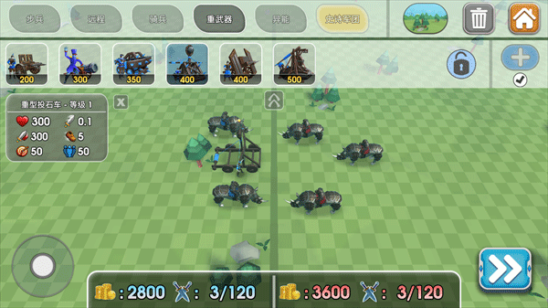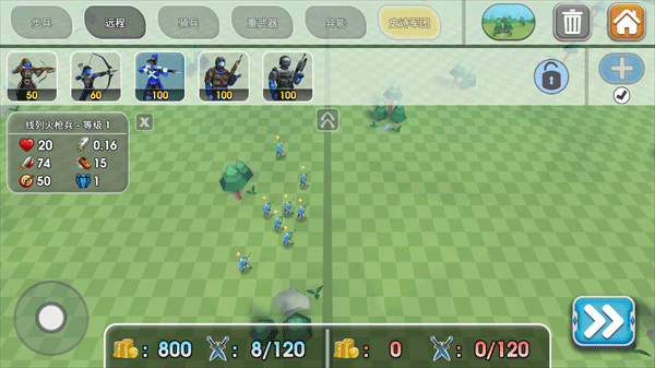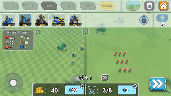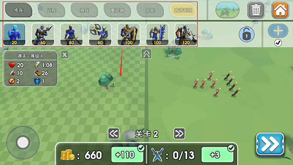 2、游戏操作十分简便。单人战役采用闯关玩法,进入游戏后,能看到敌方阵营的状况。你可按顺序部署自己的队伍,仅需点击上方任意一个兵种,接着点击空白处,就能把该兵种部署在这个位置,要是再次点击,便可取消此次部署。