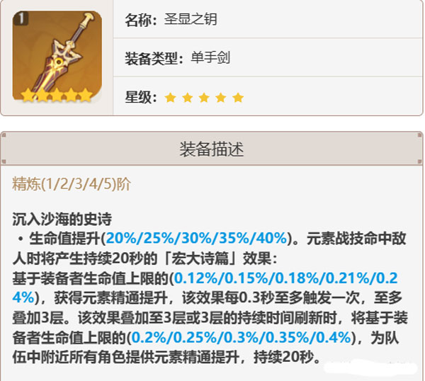 武器简评:圣显之钥是一把白值极低、副属性极高的武器,其副属性为生命值。武器效果还带有一些团队辅助属性。然而,单手剑角色中能受益于生命值增益的并不多,所以该武器的泛用性十分有限。并且,圣显之钥对妮露的提升极为显著,有无此武器,妮露仿佛判若两个角色。鉴于目前主词条为生命值的单手剑仅有这一把,没有圣显之钥的妮露通常只能选择精通单手剑。因此,对于拥有妮露队且原石充足的玩家而言,还是很值得抽取一把圣显之钥的。