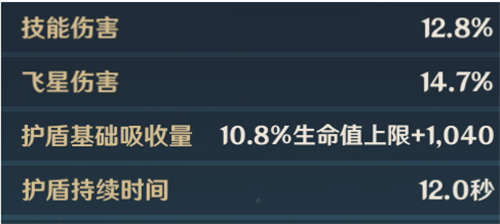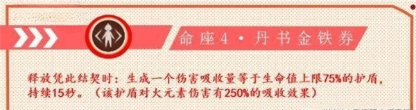 命座4:释放大招后,能生成一个生命值上限75%的护盾值,持续时间15秒。提供了一个良好的输出环境,毕竟作为战场主c能为自身加盾是非常棒的机制,防止暴毙和重击被打断,输出稳定。