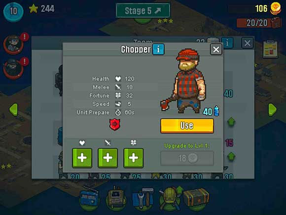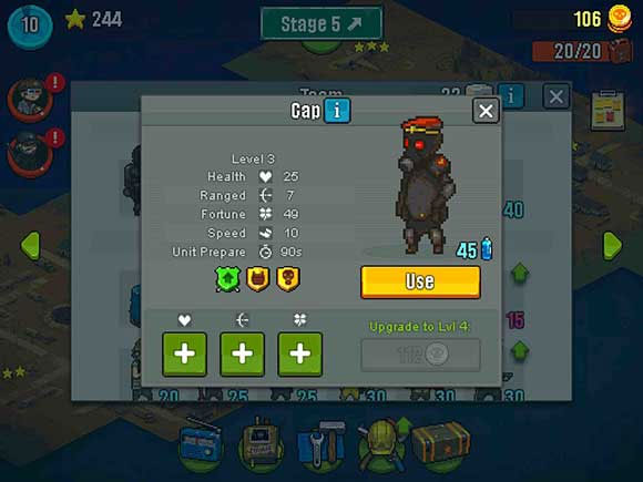 每一个兵种配合了相应的装备物资,玩家作为指挥大哥,还要为自己的小弟装配好攻击、防御、血量的加成装备,这些装备会通过战斗获得,也有商店可以购买。